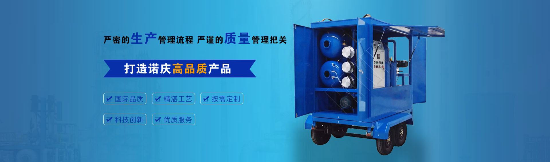 公司通過ISO9001-2015質(zhì)量管理體系認證,CE歐盟認證,諾慶公司所有濾油機配套產(chǎn)品均采用國內(nèi)外知名品牌,經(jīng)過多年的使用,具有質(zhì)量可靠,性能優(yōu)良。公司擁有完備的檢測儀器和檢測設備,所有產(chǎn)品出廠前經(jīng)過嚴格測試,保證每一臺產(chǎn)品合格出廠。生產(chǎn)實力雄厚